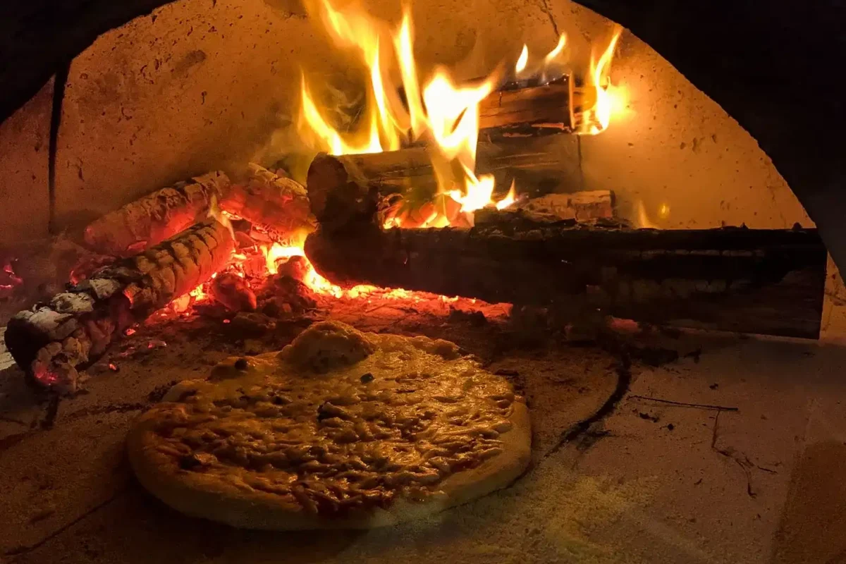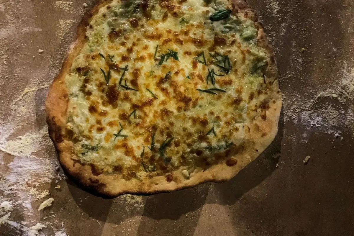 Dîner composé de pizza au feu de bois et de bière brassée localement.
